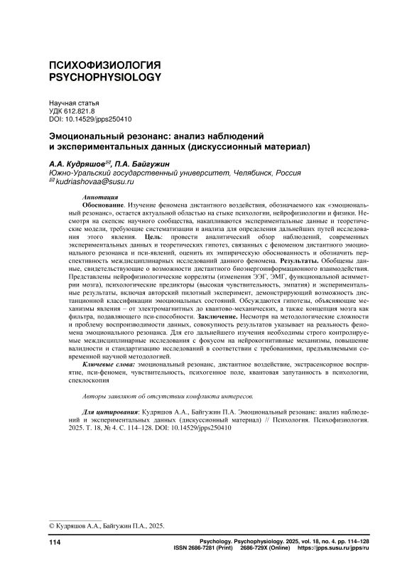 Обоснование. Изучение феномена дистантного воздействия, обозначаемого как «эмоциональный резонанс», остается актуальной областью на стыке психологии, нейрофизиологии и физики. Несмотря на скепсис научного сообщества, накапливаются экспериментальные данные и теоретические модели, требующие систематизации и анализа для определения дальнейших путей исследования этого явления. Цель: провести аналитический обзор наблюдений, современных экспериментальных данных и теоретических гипотез, связанных с феноменом дистантного эмоционального резонанса и пси-явлений, оценить их эмпирическую обоснованность и обозначить перспективность междисциплинарных исследований данного феномена. Результаты. Обобщены данные, свидетельствующие о возможности дистантного биоэнергоинформационного взаимодействия. Представлены нейрофизиологические корреляты (изменения ЭЭГ, ЭМГ, функциональной асимметрии мозга), психологические предикторы (высокая чувствительность, эмпатия) и экспериментальные результаты, включая авторский пилотный эксперимент, демонстрирующий возможность дистанционной классификации эмоциональных состояний. Обсуждаются гипотезы, объясняющие механизмы явления – от электромагнитных до квантово-механических, а также концепция мозга как фильтра, подавляющего пси-способности. Заключение. Несмотря на методологические сложности и проблему воспроизводимости данных, совокупность результатов указывает на реальность феномена эмоционального резонанса. Для его дальнейшего изучения необходимы строго контролируемые междисциплинарные исследования с фокусом на нейрокогнитивные механизмы, повышение валидности и стандартизацию исследований в соответствии с требованиями, предъявляемыми современной научной методологией.