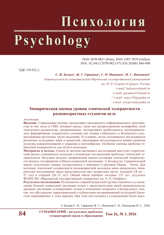 Introduction. Contemporary challenges in the increasingly saturated information space (including the media and online environment), such as the spread of xenophobia, ideas of ethnic radicalism, and discrimination, highlight the need for targeted development of a tolerant consciousness as the basis for stable and secure coexistence between diverse population groups. In a context where adherents of different cultural norms and values clash, the issue of developing a culture of mutual understanding and respect for diversity naturally becomes relevant. The issue of ethnic tolerance is particularly significant for children and youth. Materials and Methods. One of the methods used in this study was a theoretical analysis of existing approaches to the problem of ethnic tolerance. The leading method for empirically assessing the state of ethnic tolerance was testing (E. Bogardus’s Social Distance Scale). A comparative analysis of the obtained data was conducted using the Mann-Whitney U-test. To study ethnic tolerance among young people of different ages, we conducted an empirical study among representatives of two age groups: the younger group (aged 18–21) and the older group (aged 26–35). The total sample size was 155 people (students at National Research Ogarev Mordovia State University). Results. Respondents in the older age group tend to maintain close social distance only with representatives of their own ethnicity, and maintain a moderate social distance only with Tatar and Belarusian ethnic groups, reflecting their territorial and subjectively perceived cultural proximity to these peoples. However, they tend to maintain a higher social distance from representatives of most ethnic groups from near and far abroad compared to the younger age group. Discussion and Conclusion. The identified signs of intolerance among older students toward most of the subjects can also be interpreted in the context of the age characteristics of this sample. The unconscious projection of negative attitudes and experiences in self-perception onto others («outsiders») is one of the individual’s psychological defense mechanisms. As a result, intolerance often arises as a natural way to channel manifestations of self-aggression.