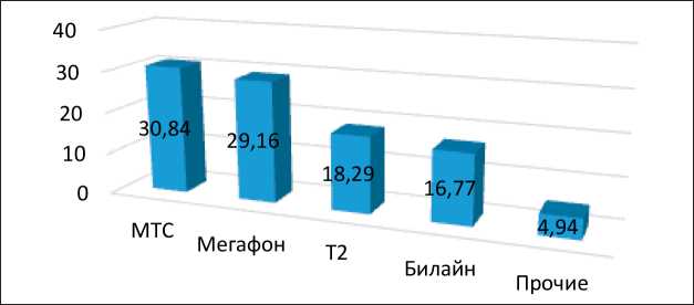 Рис. 1. Структура рынка мобильной связи России по числу обслуженных абонентов в 2023 г., % Источник: составлено авторами на основании [4]