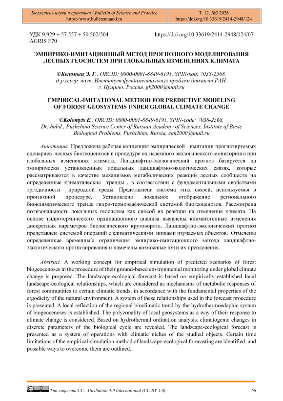Предложена рабочая концепция эмпирической имитации прогнозируемых сценариев лесных биогеоценозов в процедуре их наземного экологического мониторинга при глобальных изменениях климата. Ландшафтно-экологический прогноз базируется на эмпирически установленных локальных ландшафтно-экологических связях, которые рассматриваются в качестве механизмов метаболических реакций лесных сообществ на определенные климатические тренды , в соответствии с фундаментальными свойствами эргодичности природной среды. Представлена система этих связей, используемая в прогнозной процедуре. Установлено локальное отображение регионального биоклиматического тренда гидро-термоэдафической системой биогеоценозов. Рассмотрена полизональность локальных геосистем как способ их реакции на изменения климата. На основе гидротермического ординационного анализа выявлены климатогенные изменения дискретных параметров биологического круговорота. Ландшафтно-экологический прогноз представлен системой операций с климатическими нишами изучаемых объектов. Отмечены определенные временныʹе ограничения эмпирико-имитационного метода ландшафтно-экологического прогнозирования и намечены возможные пути их преодоления.