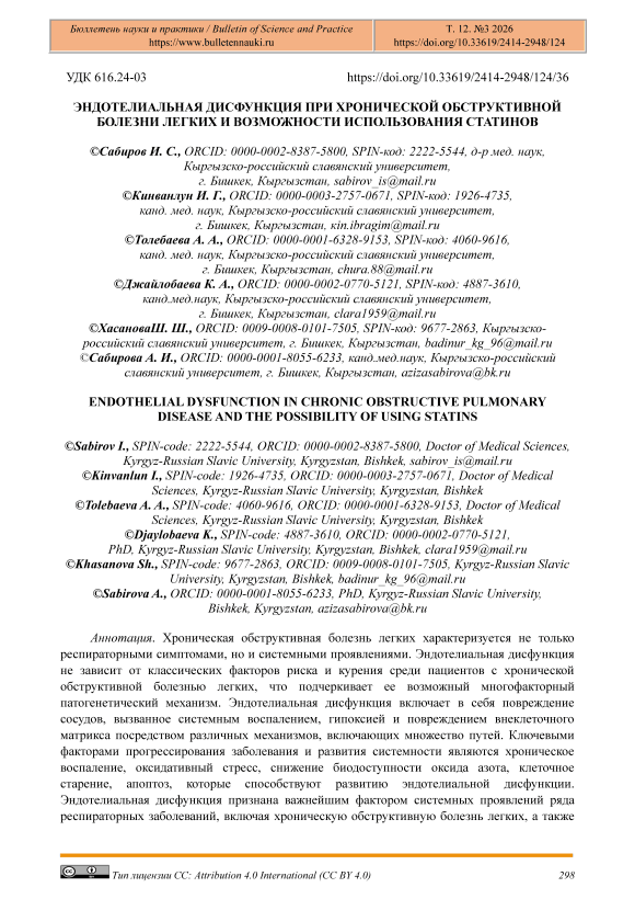 Хроническая обструктивная болезнь легких, статины, эндотелиальная дисфункция, воспаление, оксидативный стресс, снижение биодоступности оксида азота, клеточное старение, апоптоз, плейотропные свойства