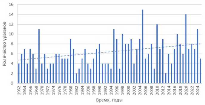 Рис. 1. Активизация ураганов Северной Атлантики. Показан линейный тренд