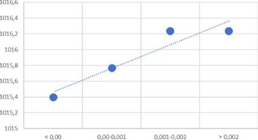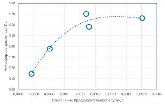 Рис. 15. Падение атмосферного давления при сокращении продолжительности суток на пути движения ураганов в Северной Атлантике (15–30° с. ш., 50–90° з. д.).