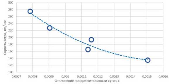 Климатологи усматривают влияние на циклоногенез потепления климата. Температура подстилающей поверхности в океане действительно во многом обеспечивает неустойчивость приземного слоя воздуха, однако остается еще нераскрытым вклад сил иной, эндогенной природы. На их вероятную роль указывает, в частности, тот факт, что годы с максимальным количеством ураганов – 2005-й (15), 2020-й (14) и 2010-й (12) – в списке самых теплых лет отнюдь не занимают первые места, а группа из пяти лет с максимальными температурами воды не отличаются от среднего уровня циклонической активности. Есть основания думать [2], что при соответствующем анализе необходимо учитывать нестабильность вращения Земли и его полувековое ускорение (рис. 3).