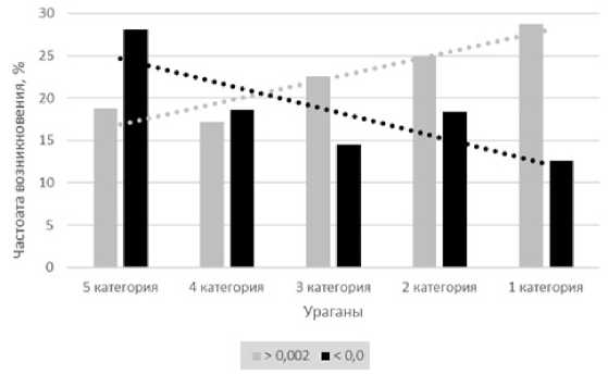 Рис. 11. Формирование ураганов при длинных (LOD > 0,002 c) и коротких (LOD < 0,0 c) сутках. Показаны линейные тренды