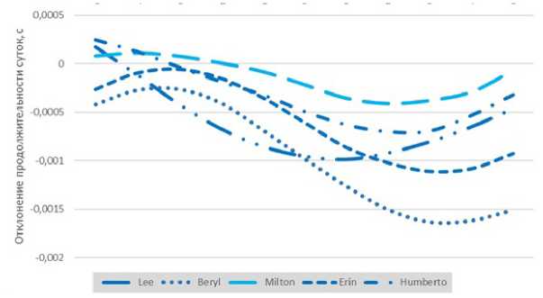 Неравномерность вращения Земли, отклонение продолжительности суток, Северная Атлантика, тропические циклоны, ураганы