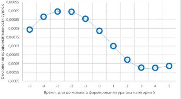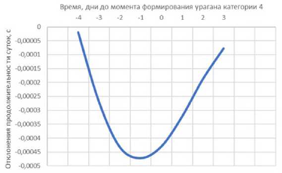 Рис. 8. Отклонения продолжительности суток при формировании ураганов пяти категории в сентябре с резко отличным временем у самых мощных циклонов