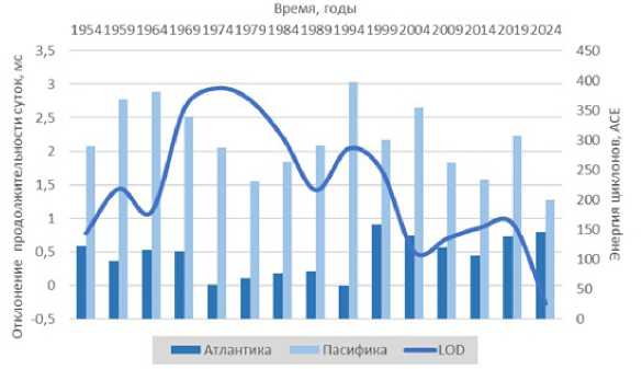 Рис. 16. Отклонения продолжительности суток и энергия тропических циклонов в Северной Атлантике и Западном секторе Тихого океана