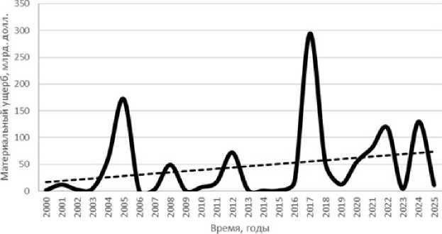 Рис. 2. Ущерб от ураганов Северной Атлантики (цены текущего года). Показан линейный тренд
