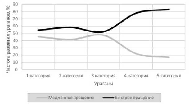 Вместе с тем ураганы двух высших категорий демонстрируют сходство в поведении, и при близких скоростях вращения Земли их можно рассматривать вместе (рис. 9 и 10).