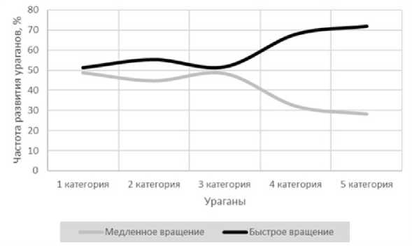 категорий 5 и 41, развивающихся преимущественно в условиях коротких суток; между тем ураганы 1 – 3 категорий реагируют на прирост скорости вращения практически одинаково (рис. 5а и 5б).