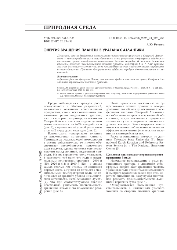 Текст научной статьи Энергия вращения планеты в ураганах Атлантики