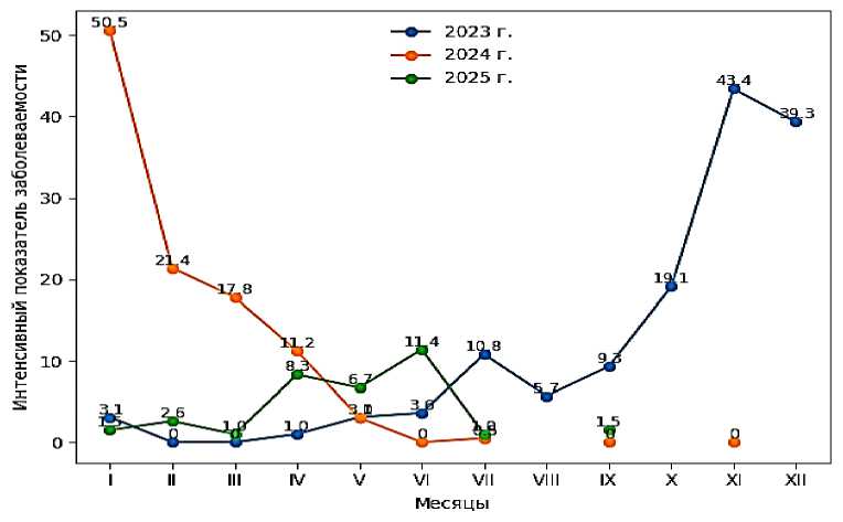Помесячный анализ заболеваемости в 2023–2025 гг. показал изменение сезонного профиля эпидемического подъёма: осенне-зимний характер в 2023 году и зимне-весенний — в 2024 году, с последующим сглаживанием сезонных колебаний и отсутствием выраженного сезонного пика в 2025 году.