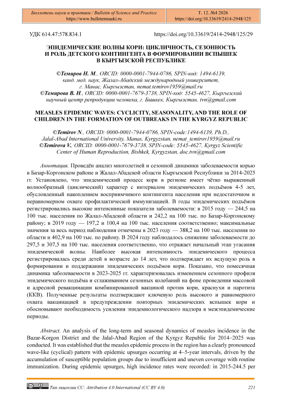 Проведён анализ многолетней и сезонной динамики заболеваемости корью в Базар-Коргонском районе и Жалал-Абадской области Кыргызской Республики за 2014-2025 гг. Установлено, что эпидемический процесс кори в регионе имеет чётко выраженный волнообразный (циклический) характер с интервалом эпидемических подъёмов 4-5 лет, обусловленный накоплением восприимчивого контингента населения при недостаточном и неравномерном охвате профилактической иммунизацией. В годы эпидемических подъёмов регистрировались высокие интенсивные показатели заболеваемости: в 2015 году — 244,5 на 100 тыс. населения по Жалал-Абадской области и 242,2 на 100 тыс. по Базар-Коргонскому району; в 2019 году — 197,2 и 100,4 на 100 тыс. населения соответственно; максимальные значения за весь период наблюдения отмечены в 2023 году — 388,2 на 100 тыс. населения по области и 402,9 на 100 тыс. по району. В 2024 году наблюдалось снижение заболеваемости до 297,5 и 307,5 на 100 тыс. населения соответственно, что отражает начальный этап угасания эпидемической волны. Наиболее высокая интенсивность эпидемического процесса регистрировалась среди детей в возрасте до 14 лет, что подтверждает их ведущую роль в формировании и поддержании эпидемических подъёмов кори. Показано, что помесячная динамика заболеваемости в 2023-2025 гг. характеризовалась изменением сезонного профиля эпидемического подъёма и сглаживанием сезонных колебаний на фоне проведения массовой и адресной ревакцинации комбинированной вакциной против кори, краснухи и паротита (ККВ). Полученные результаты подтверждают ключевую роль высокого и равномерного охвата вакцинацией в предупреждении повторных эпидемических вспышек кори и обосновывают необходимость усиления эпидемиологического надзора в межэпидемические периоды.
