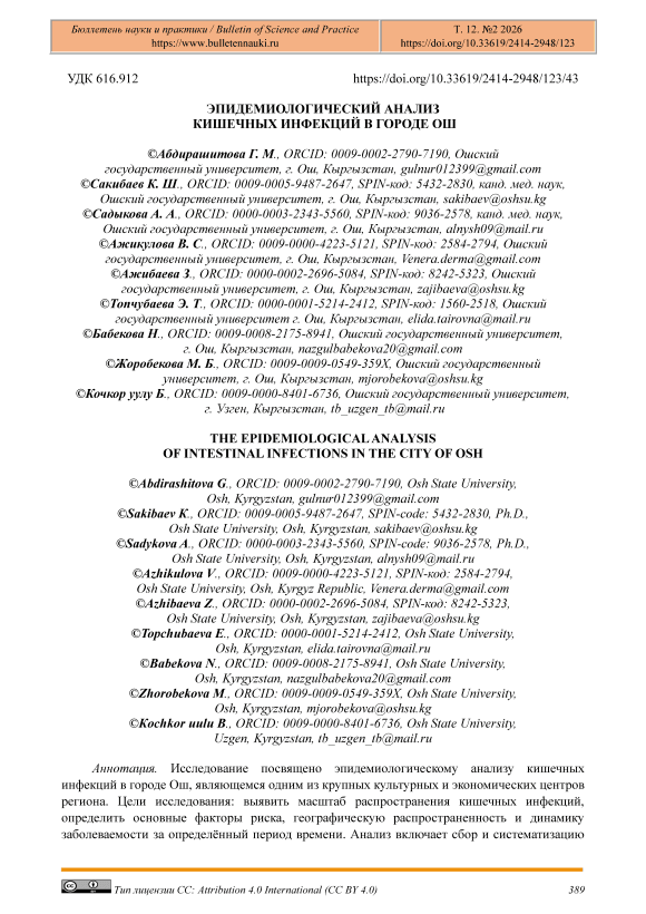 Исследование посвящено эпидемиологическому анализу кишечных инфекций в городе Ош, являющемся одним из крупных культурных и экономических центров региона. Цели исследования: выявить масштаб распространения кишечных инфекций, определить основные факторы риска, географическую распространенность и динамику заболеваемости за определённый период времени. Анализ включает сбор и систематизацию данных о зарегистрированных случаях кишечных инфекций, расчет показателей заболеваемости на основе официальной статистики, а также исследование сегментов населения по возрастным группам и социально-экономическим параметрам. Особое внимание уделяется выявлению источников инфекции, путей передачи, а также условий, способствующих распространению заболеваний, таких как санитарно-гигиеническая ситуация и качество водоснабжения. Материалы и методы исследования: в работе использованы методы эпидемиологического исследования, включая статистический анализ, картографирование очагов и анализ временных трендов. Результаты исследования: полученные результаты способствуют формированию представления о текущей ситуации по кишечным инфекциям в Ош и позволяют разработать рекомендации по профилактическим мероприятиям, направленным на снижение заболеваемости и повышение санитарной ответственности населения. Выводы: данное исследование важно для местных органов здравоохранения, так как оно служит основой для принятия решений по улучшению санитарных условий, внедрению программ вакцинации и просветительской деятельности, а также обеспечивает основу для дальнейших научных исследований в области инфекционных заболеваний региона.