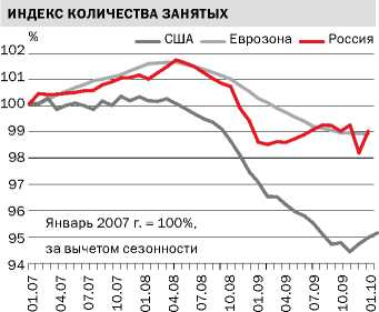 В странах с более развитыми институтами, гибкими условиями труда мы уже увидели существенное повышение производительности труда. В Соединенных Штатах Америки этот показатель в 2009 году увеличился на 2,5 п. п. В Европе занятость сократилась примерно на 1,8%, ВВП уменьшился приблизительно на 3,8%. Мы видим, что протекционистские меры европейских правительств привели к тому, что в общем производительность экономики, к сожалению, упала. Примерно такой же тренд мы наблюдаем в российской экономике — при падении ВВП примерно на 7,2 п. п. за прошлый год, сокращении занятости на 2 п. п., в целом производительность труда не выросла.