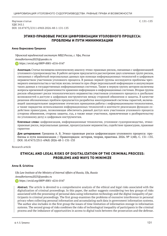 IDR: 14134610 | УДК: 343.1 | DOI: 10.47475/2311-696X-2026-48-1-131-135