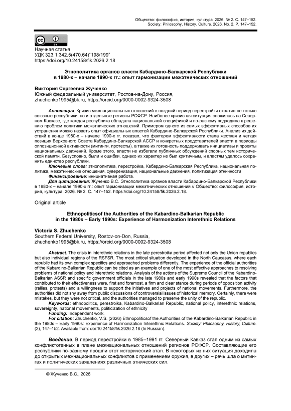 The crisis in interethnic relations in the late perestroika period affected not only the Union republics but also individual regions of the RSFSR. The most critical situation developed in the North Caucasus, where each republic had its own complex specifics and approached problems differently. The experience of the official authorities of the Kabardino-Balkarian Republic can be cited as an example of one of the most effective approaches to resolving problems of national policy and interethnic relations. Analysis of the actions of the Supreme Council of the Kabardino-Balkarian ASSR and specific government officials in the late 1980s and early 1990s revealed that the factors that contributed to their effectiveness were, first and foremost, a firm and clear stance during periods of opposition activity (rallies, protests) and a willingness to support the initiatives and projects of national movements. Furthermore, the authorities did not shy away from public discussions of controversial issues of historical memory. Certainly, there were mistakes, but they were not critical, and the authorities managed to preserve the unity of the republic.