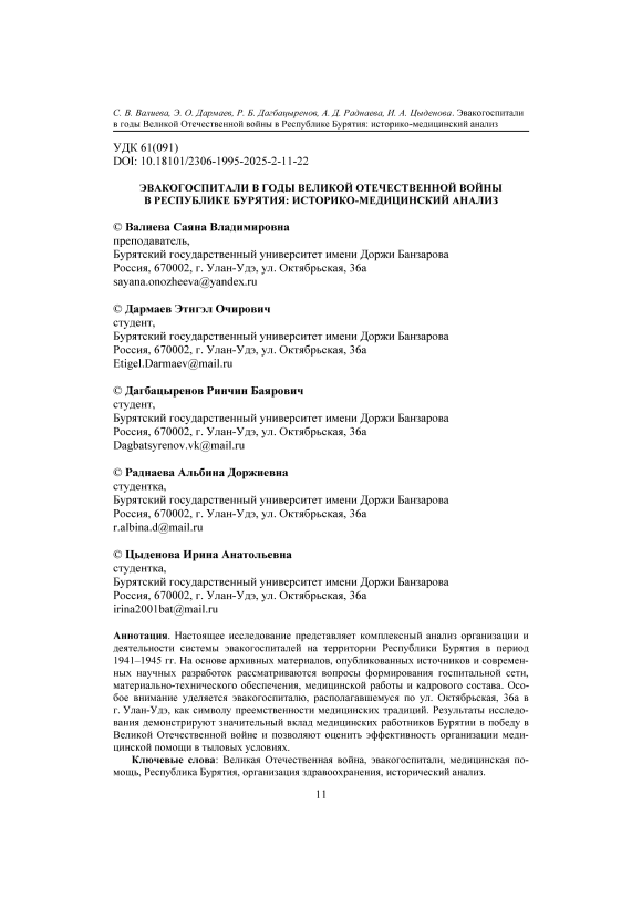 Настоящее исследование представляет комплексный анализ организации и деятельности системы эвакогоспиталей на территории Республики Бурятия в период 1941–1945 гг. На основе архивных материалов, опубликованных источников и современных научных разработок рассматриваются вопросы формирования госпитальной сети, материально-технического обеспечения, медицинской работы и кадрового состава. Особое внимание уделяется эвакогоспиталю, располагавшемуся по ул. Октябрьская, 36а в г. Улан-Удэ, как символу преемственности медицинских традиций. Результаты исследования демонстрируют значительный вклад медицинских работников Бурятии в победу в Великой Отечественной войне и позволяют оценить эффективность организации медицинской помощи в тыловых условиях.