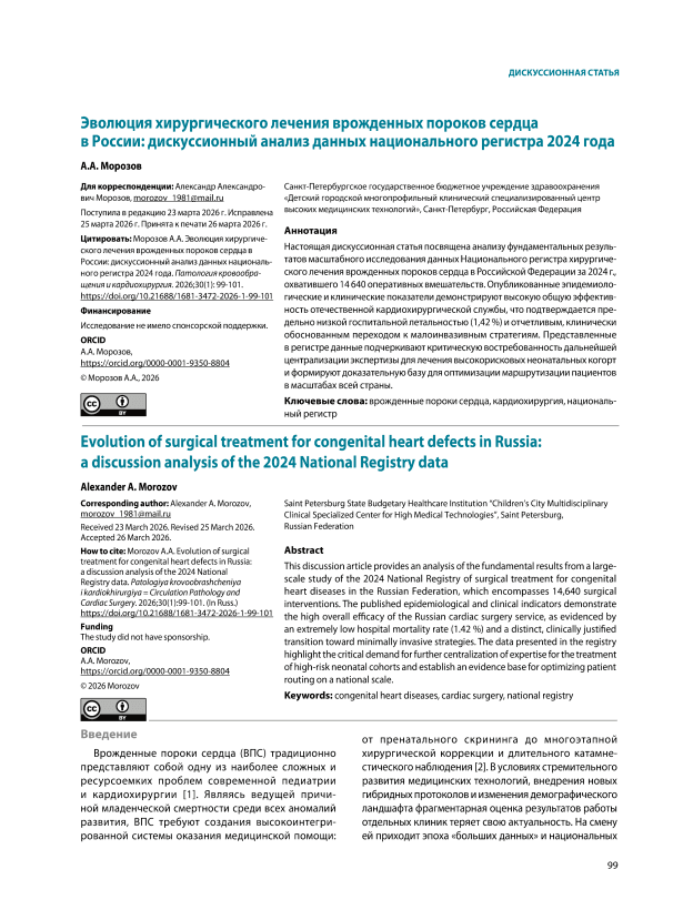 Настоящая дискуссионная статья посвящена анализу фундаментальных результатов масштабного исследования данных Национального регистра хирургического лечения врожденных пороков сердца в Российской Федерации за 2024 г., охватившего 14 640 оперативных вмешательств. Опубликованные эпидемиологические и клинические показатели демонстрируют высокую общую эффективность отечественной кардиохирургической службы, что подтверждается предельно низкой госпитальной летальностью (1,42 %) и отчетливым, клинически обоснованным переходом к малоинвазивным стратегиям. Представленные в регистре данные подчеркивают критическую востребованность дальнейшей централизации экспертизы для лечения высокорисковых неонатальных когорт и формируют доказательную базу для оптимизации маршрутизации пациентов в масштабах всей страны.