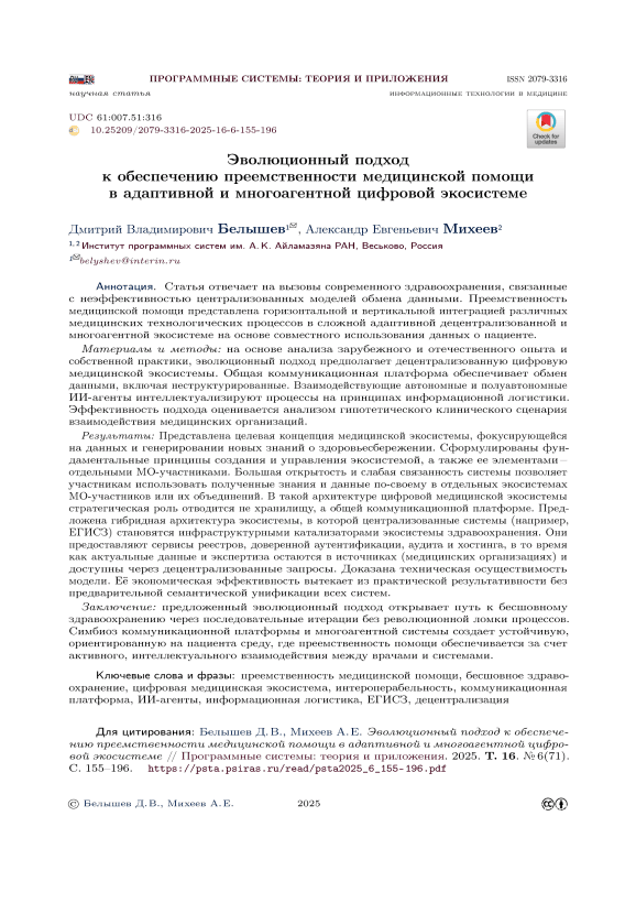 Текст научной статьи Эволюционный подход к обеспечению преемственности медицинской помощи в адаптивной и многоагентной цифровой экосистеме