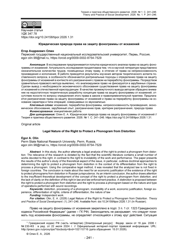 В исследовании предпринимается попытка юридического анализа права на защиту фонограммы от искажений. Актуальность исследования продиктована тем, что в научной литературе представлено незначительное количество трудов, посвященных этому праву, в отличие от права на неприкосновенность произведения и исполнения. В работе приводятся результаты изучения автором теоретического аспекта поставленного вопроса, в особенности обозначаются доктринальные подходы к определению права на защиту фонограммы от искажений в контексте его разграничения с правом на переработку фонограммы. Посредством сравнительно-правового метода выявлено, что анализируемое право не фиксируется в зарубежных странах. Сделан вывод о необходимости экономического обоснования существования права на защиту фонограммы от искажений в отечественной юриспруденции. В качестве промежуточного вывода автором обращено внимание на недостаточную теоретическую разработку концепции права на защиту фонограммы от искажений, отсутствие ясности по вопросу определения этого права в законе и правоприменительной практике. Предлагается разграничение права на защиту фонограммы от искажений и права на переработку фонограммы на основании характера и типа операций, совершаемых со звукозаписью.