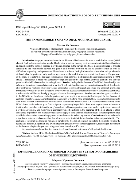 Введение: статье исследуется юридическая сила и эффективность оговорки о запрете устного изменения договора (non oral modification clause, оговорка nom). Такая оговорка, которая является стандартным условием множества договоров, требует, чтобы все изменения и дополнения к договору были оформлены в письменном виде и подписаны сторонами. Оговорка nom призвана придать определенность отношениям сторон и предотвратить проблемы, связанные с возможными злоупотреблениями, а также с трудностями доказывания устных соглашений. Актуальность обусловлена логической задачей, возникающей при нарушении этого условия, когда стороны устно достигают договоренности об изменении и начинают ее исполнять. Целью исследования является определение правовых последствий неформального изменения договора, содержащего оговорку nom. Исследование основано на сравнительно-правовом анализе правовых норм, доктринальных позиций и судебной практики отдельных стран, в том числе России. Результаты: юридическая эффективность оговорки nom вызывает разногласия, поскольку она создает коллизию между свободой сторон связывать себя обязательствами и свободой изменять договорные отношения. Существуют различные подходы в решении данной проблемы. Так, один подход заключается в свободе преодоления оговорки: стороны свободны преодолеть оговорку, поскольку устное изменение договора означает их отказ от условия nom, обеспечивая приоритет новому соглашению. Другой подход заключается в придании приоритета условию о запрете устных соглашений: оговорка связывает стороны, и ее игнорирование является неприемлемым игнорированием автономии воли. Поэтому любые соглашения, достигнутые с нарушением формы, не имеют юридической силы. Международные акты, такие как Венская конвенция о международной куплепродаже товаров, признают действительность оговорки nom, но вводят механизм защиты добросовестности: поведение стороны может исключить для нее возможность ссылаться на оговорку в той мере, в какой другая сторона полагалась на такое поведение. В российской практике суды, как правило, требуют доказательств наличия письменного соглашения, причем изменение договора конклюдентными действиями при наличии оговорки nom часто признается невозможным. Для государственных и муниципальных контрактов действуют императивные ограничения: фактическое выполнение дополнительных работ не обязывает к оплате при отсутствии письменного соглашения. Выводы: оговорка nom является значимым инструментом договорного права, позволяющим сторонам ограничивать свою будущую свободу в пользу предсказуемости. Проблема неформальных изменений остается парадоксом: свобода договора распространяется на право добровольно ограничивать эту свободу. Законодательство и правоприменительная практика предлагают гибкие решения, связанные с необходимостью оценивать справедливость соблюдения или преодоления оговорки в данном конкретном случае.