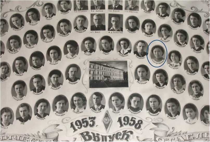 Рис. 2. Выпускники 1958 г. химического факультета Иркутского госуниверситета (Ж. Г. Базарова — четвертая справа в третьем ряду)