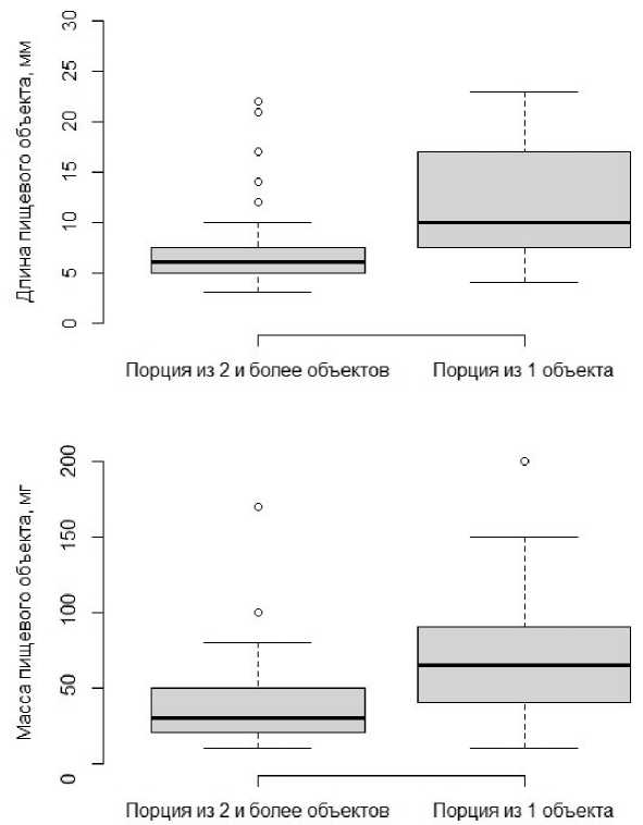 Рис. 11. Сравнение длин и масс пищевых объектов из порций, состоящих из 2 и более объектов, и порций, состоящих из 1 кормового объекта