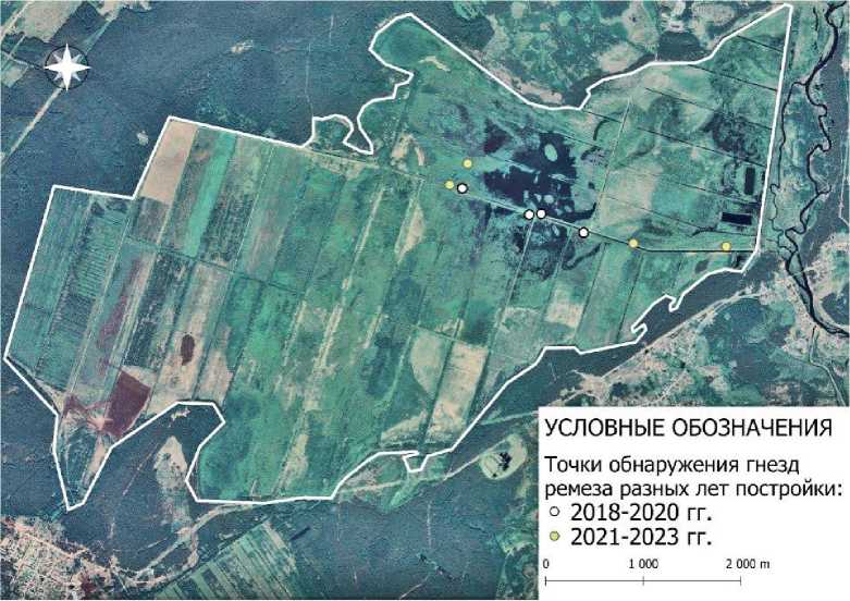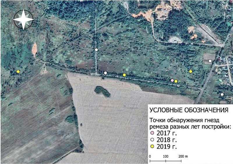 Точки обнаружения гнезд ремеза разных лет постройки: о 2018-2020 гг.