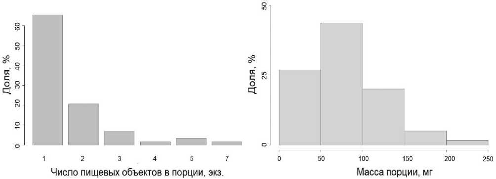 Рис. 9. Распределение порций корма по числу пищевых объектов и массе