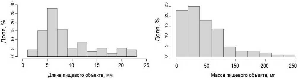 Рис. 10. Распределение пищевых объектов по длине и массе
