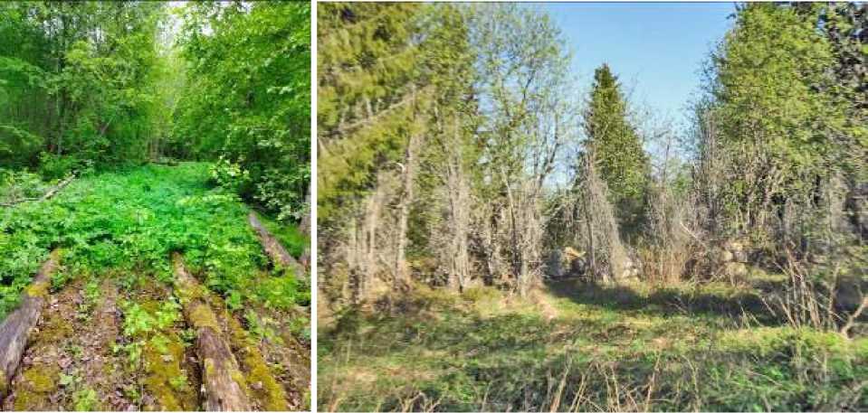 Рис. 1 (слева). Рухнувший мост на зарастающей дороге к лугам у исчезнувшей деревни Косельга среди поднявшегося мелколесья. Июнь 2025 года. Фото авторов.