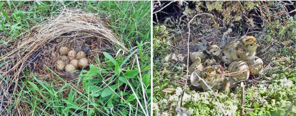 Рис. 6 (справа). Гнездо тетерева Lyrurus tetrix с вылупившимися птенцами на верховом Мошболоте на острове Кижи. 10.06.2014. Фото авторов