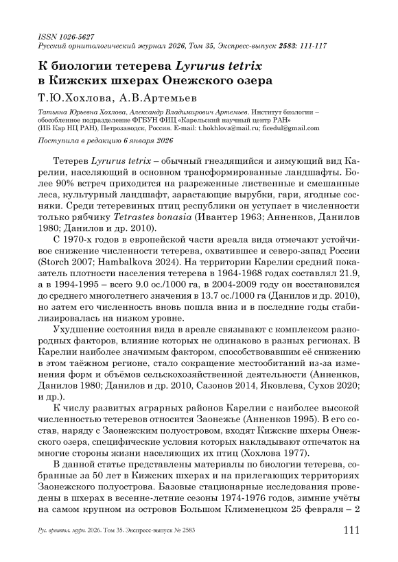 Текст статьи К биологии тетерева Lyrurus tetrix в Кижских шхерах Онежского озера