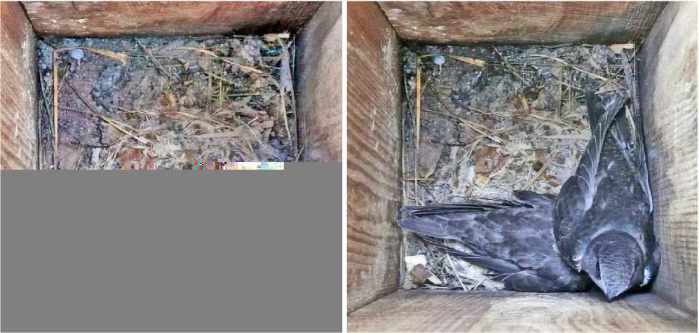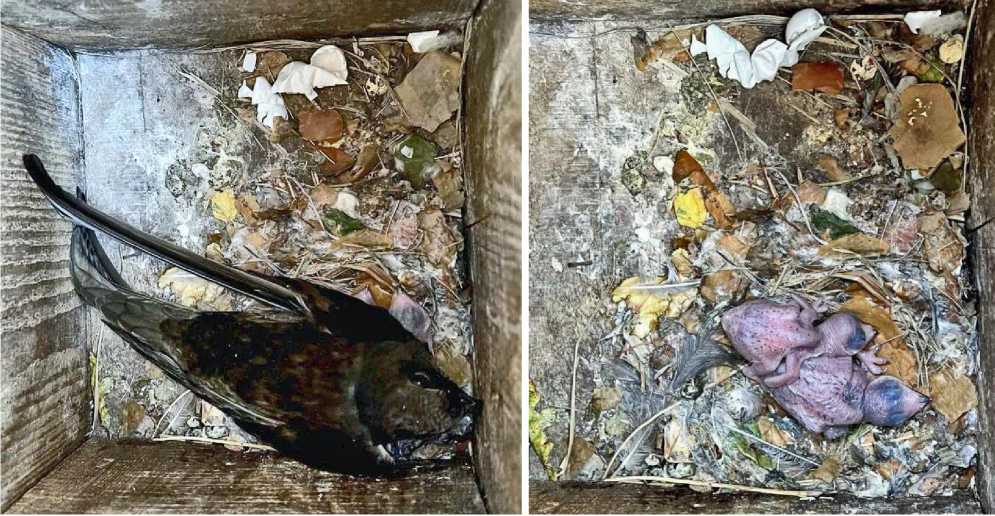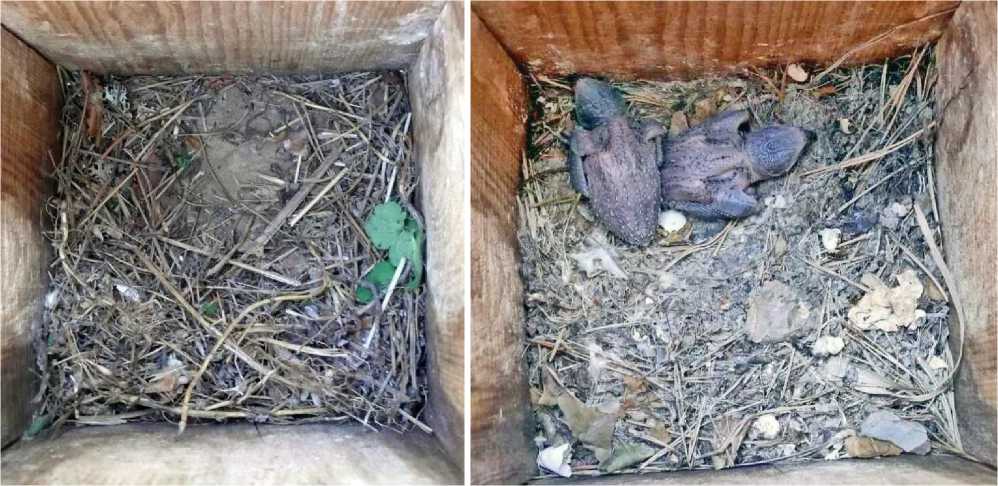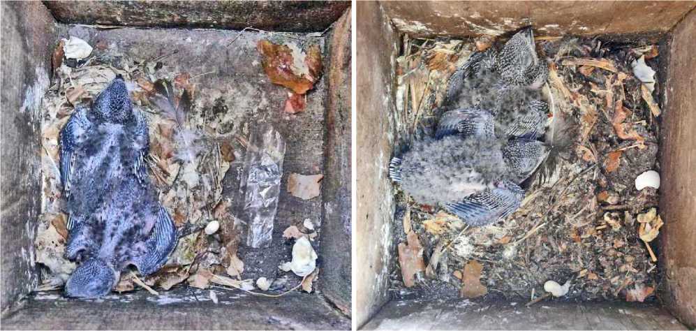 В 2025 году оба этих искусственных гнездовья снова были заселены скворцами, но яйца были отложены в среднем на 3 дня позже, чем в 2024 году. Возможно, этот сдвиг по срокам определил то, что стрижи разорили кладку скворца в гнездовье № 13, выбросив яйца из скворечника (рис 3). В гнездовье № 7 стрижи убили 2 оперённых птенцов (на теле были видны характерные точки-кровоподтёки от когтей), а 2 других птенца скворца остались живы и благополучно вылетели (рис. 3). В 2025 году размножение второй пары стрижей не зарегистрировано.