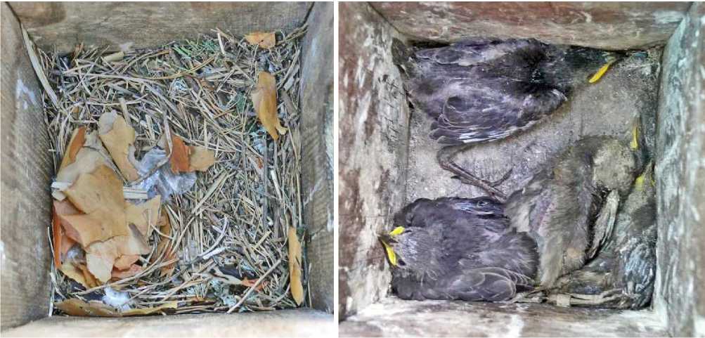 Рис. 1. Слева – внешний вид содержимого скворечника до начала размножения стрижей (28.04.); справа – гнездо с птенцами чёрного стрижа Apus apus в возрасте 6-7 сут (04.07.2022)