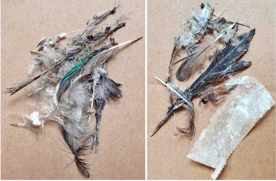 Рис. 8. Перья и мусор антропогенного происхождения из гнёзд чёрного стрижа Apus apus