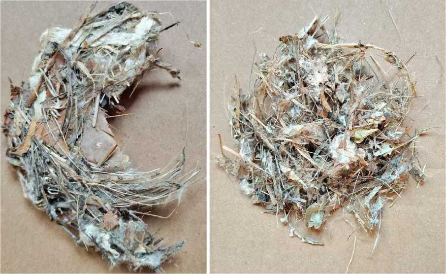 Кроме растительных компонентов, в каждом из осмотренных нами гнёзд обнаружены перья (от 3 до 13 штук, в среднем – 4.5% от общей массы гнезда), а также единичные фрагменты мусора антропогенного происхождения (рис. 8).
