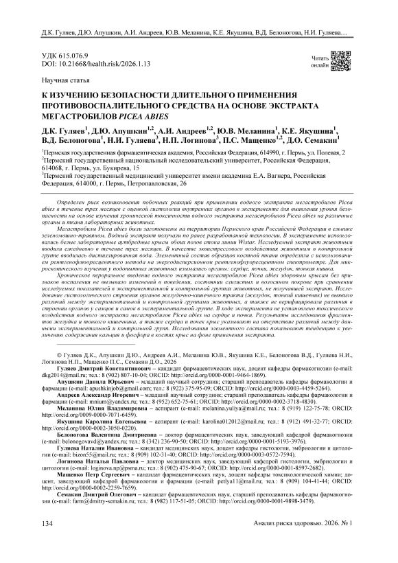 Определен риск возникновения побочных реакций при применении водного экстракта мегастробилов Picea abies в течение трех месяцев с оценкой гистологии внутренних органов в эксперименте для выявления уровня безопасности на основе изучения хронической токсичности водного экстракта мегастробилов Picea abies на различные органы и ткани лабораторных животных. Мегастробилы Picea abies были заготовлены на территории Пермского края Российской Федерации в ельнике зеленомошно-травяном. Водный экстракт получали по ранее разработанной технологии. В эксперименте использо-вались белые лабораторные аутбредные крысы обоих полов стока линии Wistar. Исследуемый экстракт животным вводили ежедневно в течение трех месяцев. В качестве эквистрессового воздействия животным в контрольной группе вводилась дистиллированная вода. Элементный состав образцов костной ткани определяли с использованием рентгенофлюоресцентного метода на энергодисперсионном рентгенофлуоресцентном спектрометре. Для микроскопического изучения у подопытных животных изымались органы: сердце, почки, желудок, тонкая кишка. Указанные характеристики позволяют заключить, что применение водного экстракта мегастробилов Picea abies в дозе 12 мг/кг в течение 12 недель не приводит к возникновению значимых нарушений как во внешних покровах, так и в строении внутренних органов экспериментальных животных. Хроническое пероральное введение водного экстракта мегастробилов Picea abies здоровым крысам без признаков воспаления не вызывало изменений в поведении, состоянии слизистых и волосяном покрове при сравнении исследуемых показателей в экспериментальной и контрольной группах животных, не получавшей экстракт. Исследование гистологического строения органов желудочно-кишечного тракта (желудок, тонкий кишечник) не выявило различий между экспериментальной и контрольной группами животных, а также не верифицировали различия в строении органов у самцов и самок в экспериментальной группе. В ходе эксперимента не установлено токсического воздействия водного экстракта мегастробилов Picea abies на сердце и почки. Результаты исследования фрагментов желудка и тонкого кишечника, а также сердца и почек крыс указывают на отсутствие различий между данными экспериментальной и контрольной групп. Исследования элементного состава показывают тенденцию к увеличению содержания кальция и фосфора в костях крыс на фоне применения экстракта.
