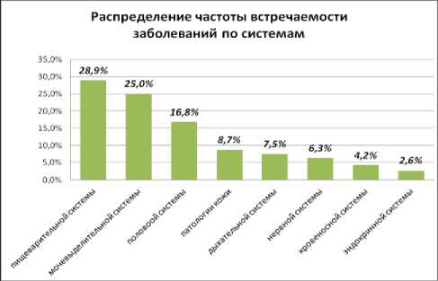 Представленная диаграмма 1 показывает, что болезни органов мочевыделительной системы занимают второе место по частоте регистрации и составляют 25% от общего числа обращений владельцев кошек.