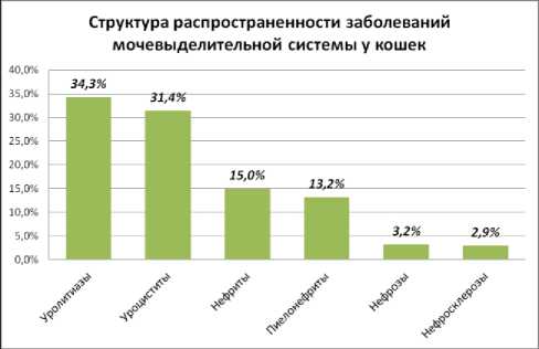 Согласно данным, представленным на рис. 2, уролитиазы и уроциститы составляют значительную долю заболеваний мочевыделительной системы у кошек – 34,3% и 31,4% соответственно. Это свидетельствует о высокой распространённости данных патологий и их существенном влиянии на здоровье кошек. Бактериальный цистит, как подтип уроцистита, представляет собой серьёзное заболевание, которое может существенно снижать качество жизни животного и приводить к развитию осложнений, таких как пиелонефрит и почечная недостаточность.