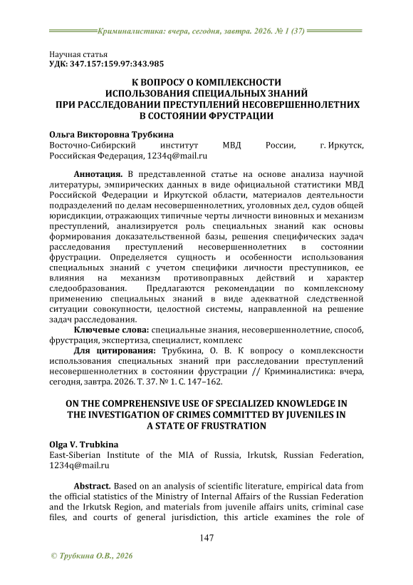 In the presented article, based on an analysis of scientific literature, empirical data in the form of official statistics from the Ministry of Internal Affairs of the Russian Federation and the Irkutsk Region, materials from units dealing with juvenile affairs, criminal cases, and general jurisdiction courts reflecting the typical characteristics of offenders' personalities and crime mechanisms, the role of specialized knowledge is analyzed as the basis for forming an evidentiary foundation and solving specific tasks in investigating crimes committed by minors in a state of frustration. The essence and features of the use of specialized knowledge are determined, taking into account the specifics of the criminal’s personality, its influence on the mechanism of unlawful actions, and the nature of trace formation. Recommendations are proposed for the comprehensive application of specialized knowledge in the form of an appropriate investigative situation—a set, a holistic system—aimed at solving the tasks of the investigation.