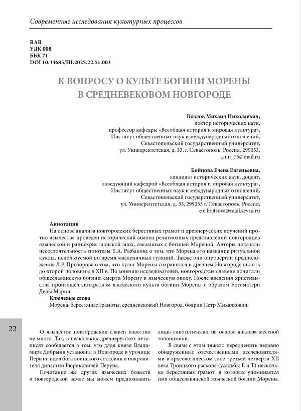 На основе анализа новгородских берестяных грамот и древнерусских поучений против язычества проведен исторический анализ религиозных представлений новгородцев языческой и раннехристианской эпох, связанных с богиней Мореной. Авторы показали несостоятельность гипотезы Б.А. Рыбакова о том, что Морена это название ритуальной куклы, используемой во время масленичных гуляний. Также они опровергли предположение Л.Р. Прозорова о том, что культ Морены сохранился в древнем Новгороде вплоть до второй половины в XII в. По мнению исследователей, новгородские славене почитали общеславянскую богиню смерти Морену в языческую эпоху. После введения христианства произошел синкретизм языческого культа богини Морены с образом Богоматери Девы Марии.