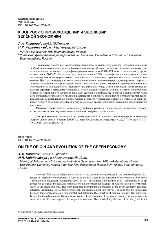 Настоящее исследование посвящено комплексному анализу эволюции концепции зелёной экономики в контексте глобальных вызовов устойчивого развития. Основное внимание уделено выявлению ключевых этапов формирования концепции (1970–1990-е гг. – становление теоретических основ; 2000–2010-е гг. – институционализация; с 2020 г. – дифференциация подходов), а так-же анализу факторов, определяющих разнообразие современных стратегий перехода к зелёной экономике. Центральным результатом исследования стало выделение четырёх доминирующих парадигм зелёной экономики: ресурсно-эффективной, институциональной, социально-трансформационной и технологически-инновационной. Показано, что различия между этими подходами носят принципиальный характер и определяют специфику национальных моделей. Важным выводом является подтверждение нелинейного характера эволюции зелёной экономики, где прогресс в одних сферах часто сопровождается стагнацией в других. Практическая значимость заключается в разработке дифференцированных рекомендаций по формированию стратегий устойчивого развития с учётом: уровня технологического развития; качества институциональной среды; специфики социально-экономического контекста.