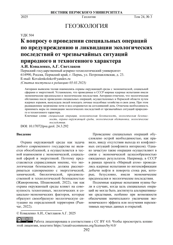 Авторами выявлена тесная взаимосвязь охраны окружающей среды с экономической, социальной сферами и энергетикой. Установлено, что проводимые в СССР мирные ядерные испытания имели экономические предпосылки и экологические последствия. Авторами отмечено, что экологическая обстановка после проведения специальных операций, осуществленных в Пермской области путем ядерных взрывов, вынуждала людей покидать личные подсобные хозяйства и свои дома. При этом радиационное загрязнение почв и вод сохраняется на сегодняшний день. Отмечена необходимость принимать меры по ликвидации экологических последствий от чрезвычайных ситуаций природного и техногенного характера.