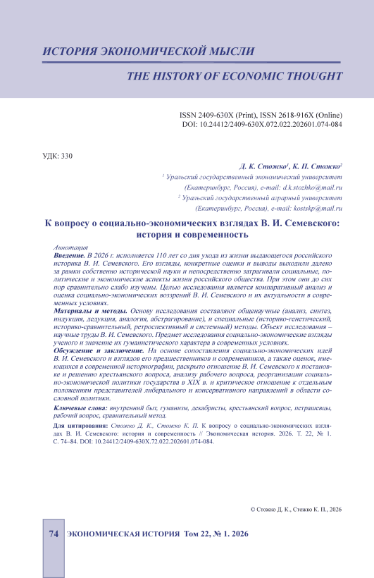 Introduction. 2026 marks the 110th anniversary of the passing of the eminent Russian historian V. I. Semevsky. His views, specific assessments, and conclusions extended far beyond the scope of historical scholarship and directly affected the social, political, and economic aspects of Russian society. However, they remain relatively understudied. The aim of this study is a comparative analysis and assessment of V. I. Semevsky’s socio-economic views and their relevance in contemporary conditions. Materials and Methods. The research is based on general scientific methods (analysis, synthesis, induction, deduction, analogy, abstraction) and specialized methods (historical-genetic, historical-comparative, retrospective, and systemic). The object of the study is the scientific works of V. I. Semevsky. The subject of the study is the scholar’s socioeconomic views and the significance of their humanistic nature in modern conditions. Discussion and Conclusion. By comparing V. I. Semevsky’s socio-economic ideas with the views of his predecessors and contemporaries, as well as assessments available in modern historiography, this article reveals V. I. Semevsky’s approach to the formulation and resolution of the “peasant question”, the analysis of the “labor question”, the reorganization of state socio-economic policy in the 19th century, and a critical approach to certain propositions of representatives of the liberal and conservative schools of thought in the area of class policy.
