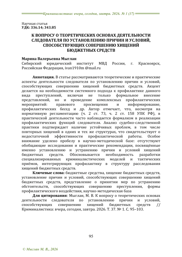 The article discusses the theoretical and practical aspects of the investigator's activities aimed at establishing the causes and conditions that contribute to the theft of budget funds. The focus is on the need for a systematic approach to the prevention of this type of crime, which includes not only the formal issuance of representations but also the implementation of comprehensive preventive measures, such as legal education, analysis of organizational shortcomings, and collaboration with the management and staff of institutions. The author notes that, despite the regulatory framework (Article 73, Part 2 of Article 158 of the Code of Criminal Procedure of the Russian Federation), there is often a lack of formalism in the implementation of the investigator's preventive functions in practical activities. An analysis of judicial and investigative practice confirms the existence of persistent problems, including repeated thefts in the same structures, which indicates the insufficient effectiveness of preventive measures. Special attention is given to the gap in the scientific and methodological framework, as there are no comprehensive studies on the subject.
