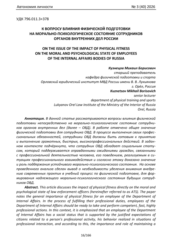 В данной статье рассматриваются вопросы влияния физической подготовки непосредственно на морально-психологическое состояние сотрудников органов внутренних дел (далее – ОВД). В работе отмечено общее значение физической подготовки для сотрудника ОВД. В процессе выполнения своих профессиональных обязанностей, сотрудники ОВД должны быть готовым к принятию и выполнению грамотных, быстрых, высокопрофессиональных действий. В заданном контексте подчёркнуто, что сотрудник ОВД обладает социальным статусом, который поддерживается оправданными ожиданиями граждан, связанными с профессиональной деятельностью человека, его поведением, реализуемым в ситуациях профессионального взаимодействия и согласно этому доказано значение и роль поддержания устойчивого морально-психологического состояния. На основе проведенного анализа сделан вывод о необходимости уделения внимания внедрению современных практик в учебный процесс по физической подготовке, для формирования надлежащего морально-психологического состояния будущих сотрудников ОВД.