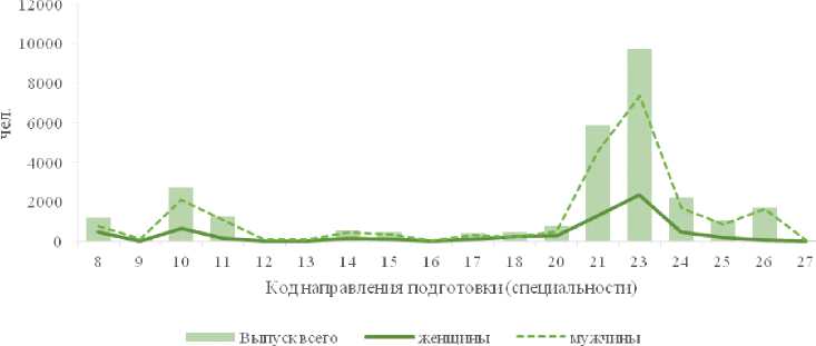 1 . В целом наблюдается значительное преобладание мужчин среди выпускников технических и инженерных специальностей. Общее количество мужчин (167 058 чел.) более чем в два раза превышает количество женщин (69 997 чел.).
